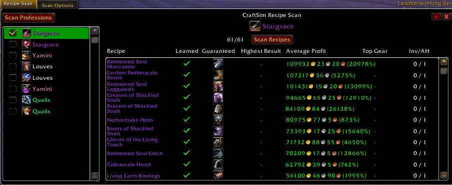 At the time of this post, there are some small issues – number one, LUA errors when you open your professions. Number two, it seems like engineering in specific has some errors when you attempt to scan Shadowlands or BFA. The addon developer is VERY active and responsive! There’s a discord and a github where you can post issues.